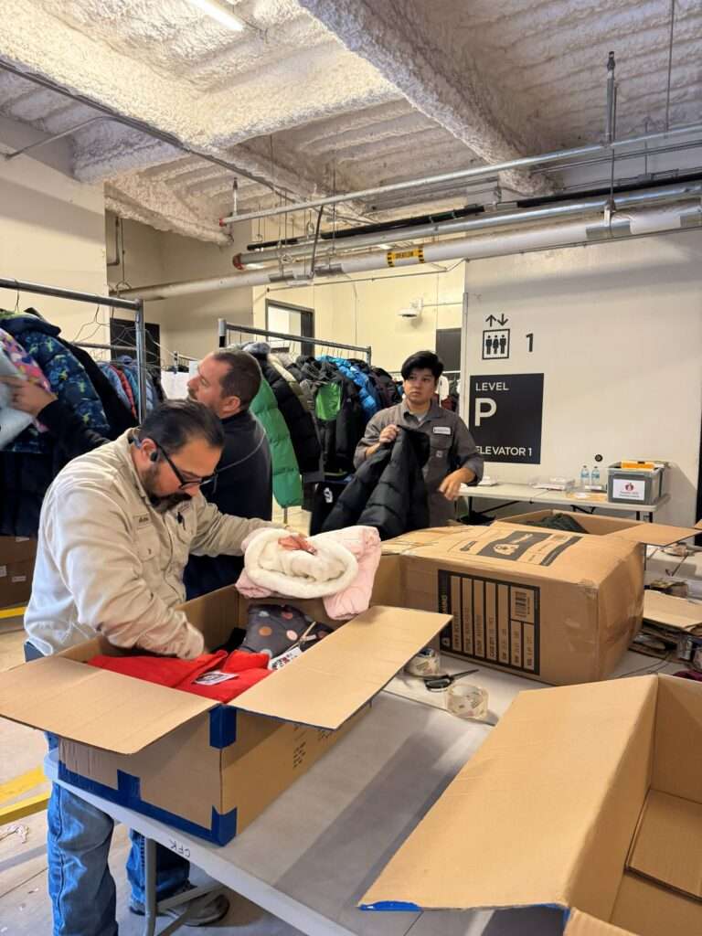Representatives from Flint Hills Resources packing coats for distribution.